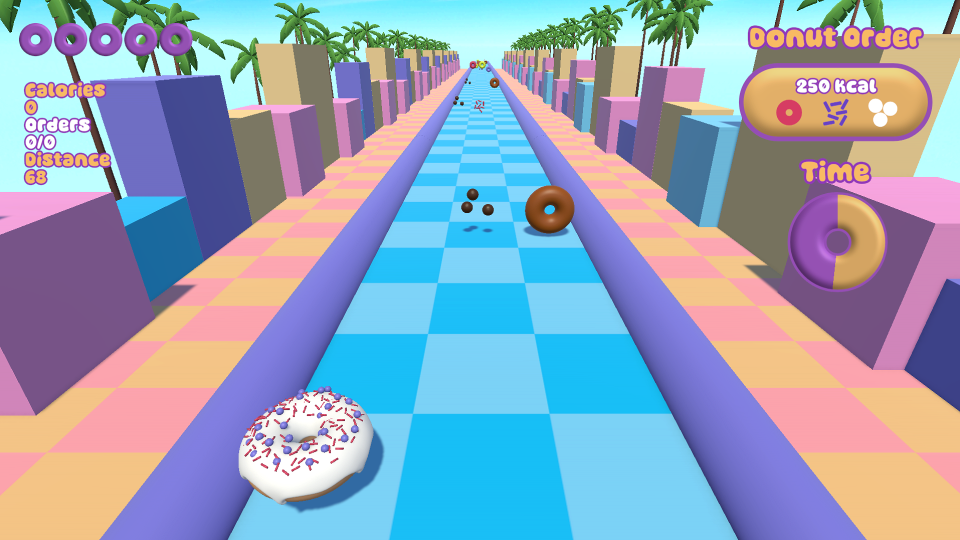 The goal of the exercise was to show that the concepts of procedural generation, saving/loading using JSON, scenes management, scriptable objects (used for "donut ingredients" data in this game) and evolution in gameplay (which is speed increasing once a certain amount of "calories" is reached in this game) were understood.